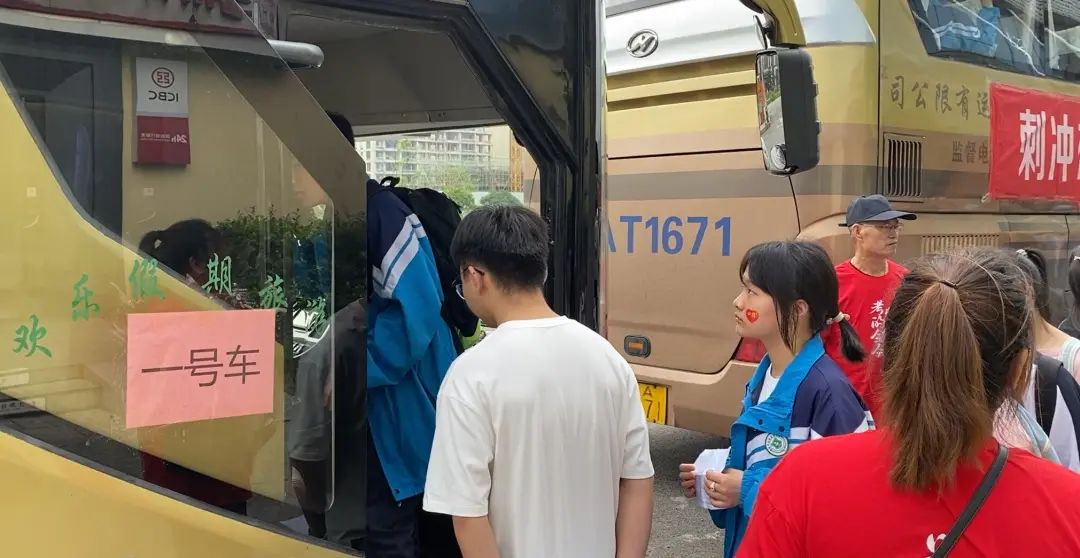 老师们在送考车前手持横幅,为孩子们摇旗呐喊,品华战士们激情满怀奔赴考车。