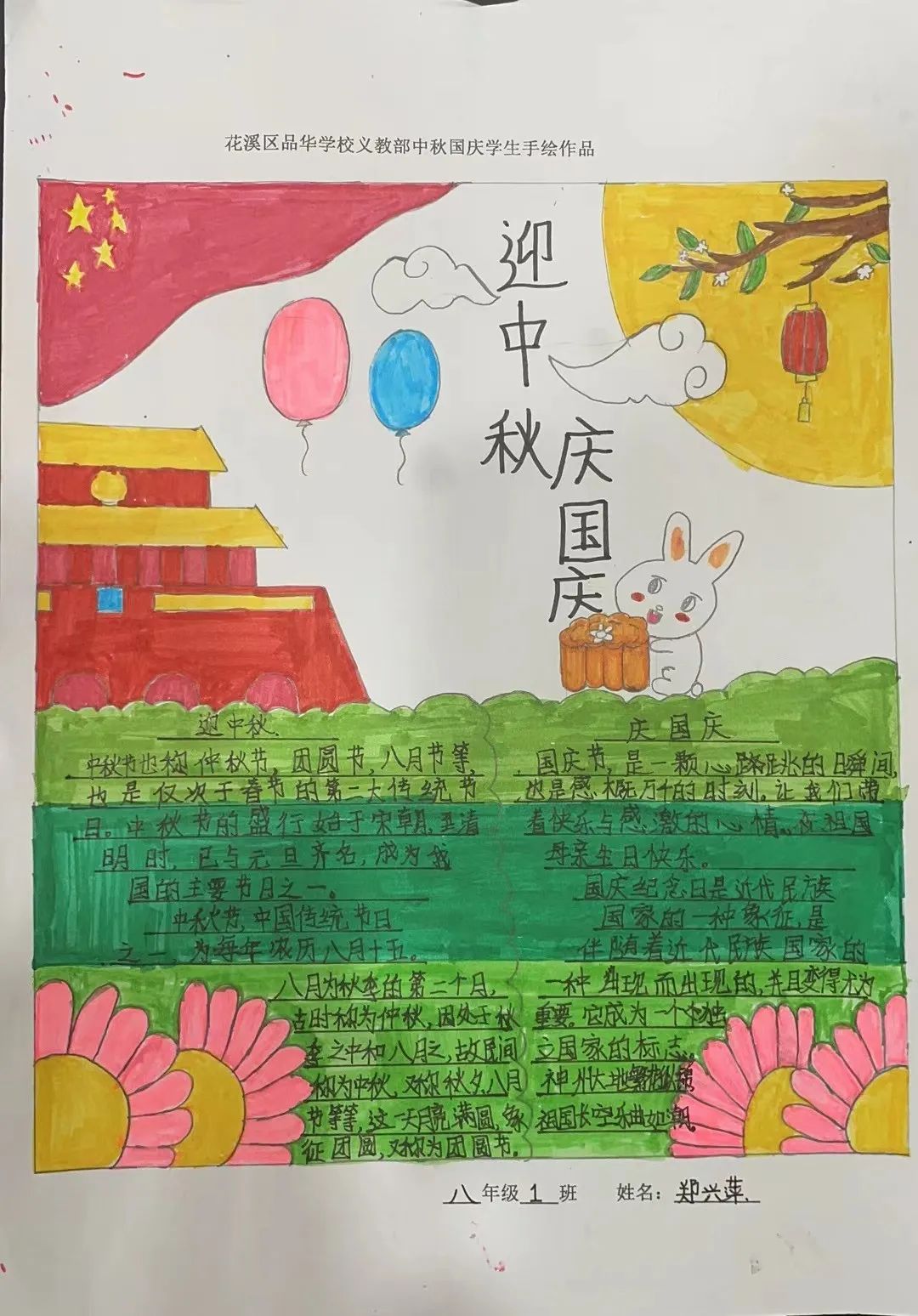 56个民族56支花,今年的中秋与国庆又撞了一次腰。国泰民安,阖家团圆。国与家撞了个满怀,国之双喜,事事团圆。“家”是国的基础,“国”是“家”的延伸,“家国”缺一不可。中秋团圆,有你有我有国有家,“家”与“国”在时间上相连,在文化上相牵。在欢度中秋国庆假期的同时,如何让这个假期更有意义呢?学校为我们设计了三类德育作业,让我们在体验式学习中培养家国情怀,在实践活动中塑造良好品德,建立文化自信,拥有民族自豪感,从而度过了一个充实而有意义的假期。以下为我们的德育作品展示合集,请您查收: