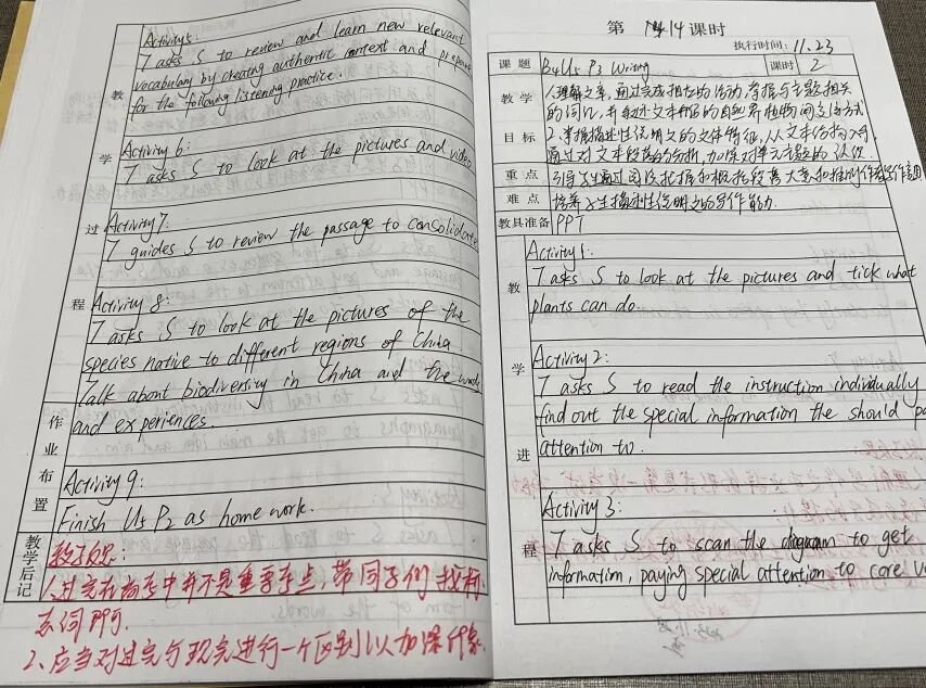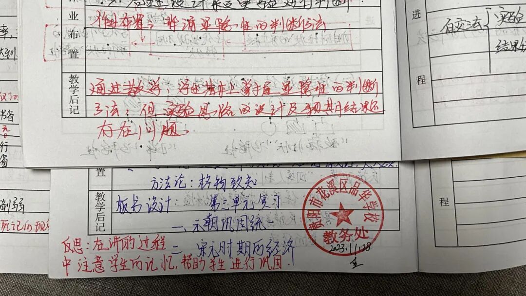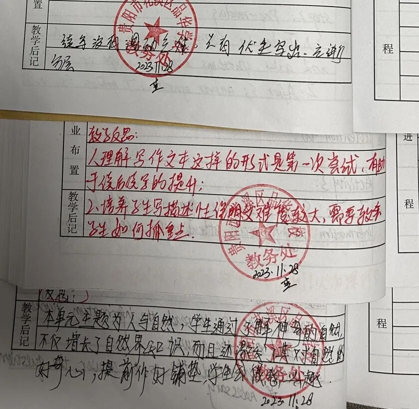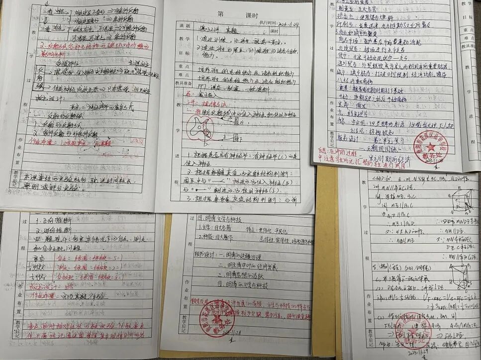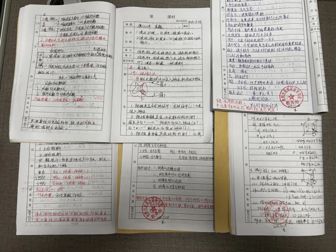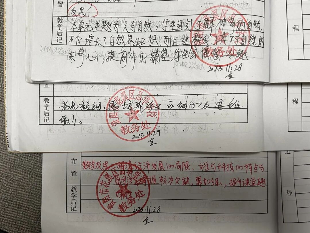 在教务检查中,总能看到老师们日常踏实工作的影子。老师按照要求制定详细的教学设计、教学过程和教学反思,紧抓教材,潜心备课,以新教材新课标为依据,结合学情,确定教学目标,切实把握好教学的正确方向。教学思路清楚,设计合理,预设充分,教学方式多样,重难点突出,兼顾了教师主导与学生主体,充分体现了新课标的教学理念。教案本上字迹工整美观,圈点标注下足功夫。