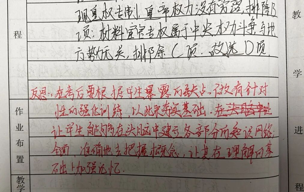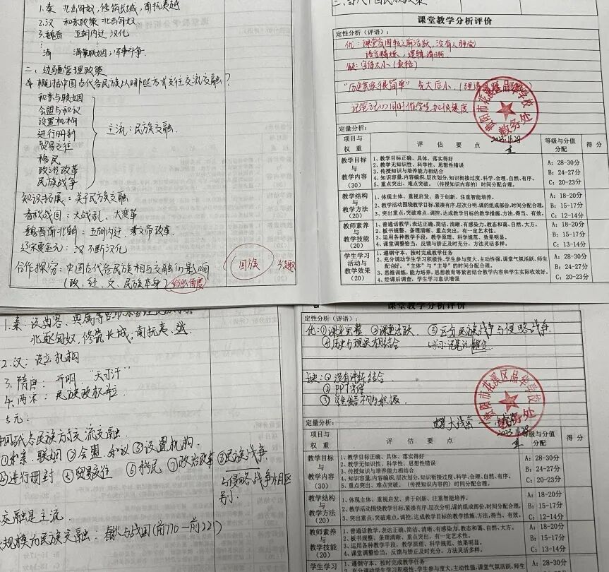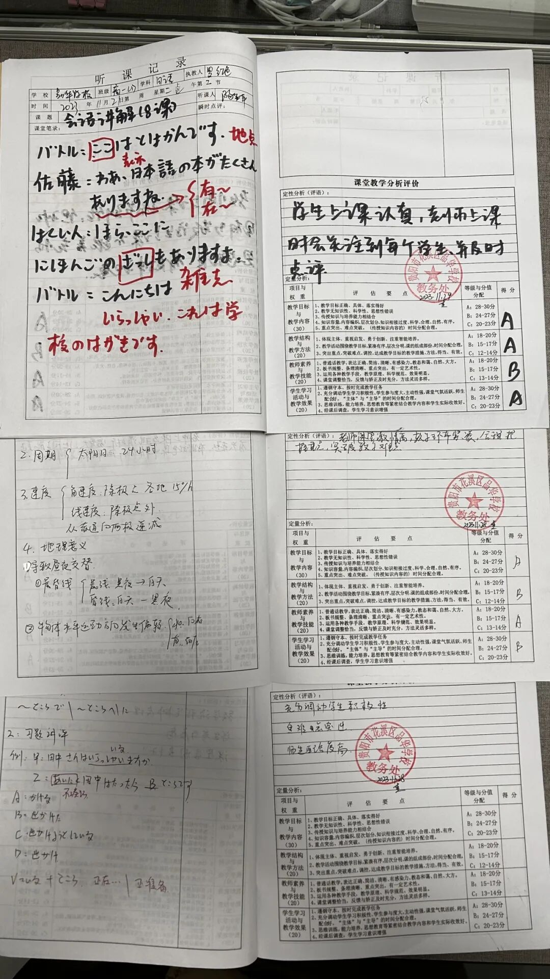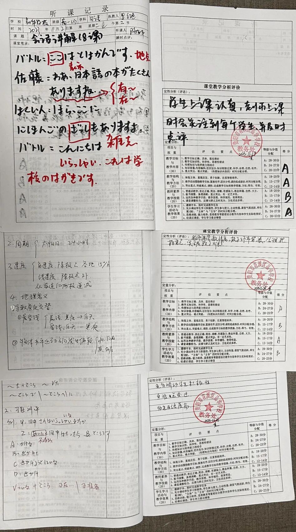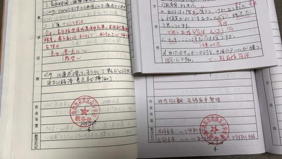 在教务检查中,总能看到老师们日常踏实工作的影子。老师按照要求制定详细的教学设计、教学过程和教学反思,紧抓教材,潜心备课,以新教材新课标为依据,结合学情,确定教学目标,切实把握好教学的正确方向。教学思路清楚,设计合理,预设充分,教学方式多样,重难点突出,兼顾了教师主导与学生主体,充分体现了新课标的教学理念。教案本上字迹工整美观,圈点标注下足功夫。