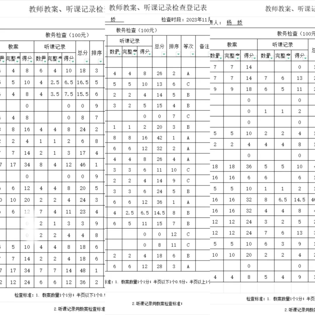 教务检查组老师本着“公平公正、互促成长”的原则,分别从教师教案、听课记录和学生作业批改等几大方面进行了认真细致的检查,检查后给每一位老师给予相应的评分和等级划分。在检查中及时发现问题、反馈问题,让老师们对照优秀学习,相互借鉴提升。