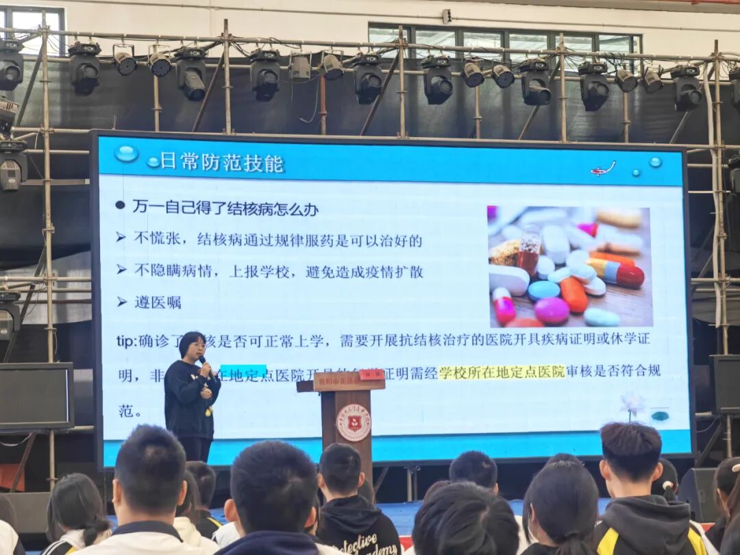 在介绍预防措施时,她特别强调,科学预防疾病的方法中最为关键的是要养成良好的生活习惯和卫生习惯,要有规律的作息,保证充足睡眠,注意饮食均衡,多参加体育锻炼,提高自身抵抗力。同时提醒同学们结核病可治可防,若出现肺结核可疑症状或被诊断为肺结核,应当主动向学校报告,不隐瞒病情、不带病上课,并主动接受规范治疗。